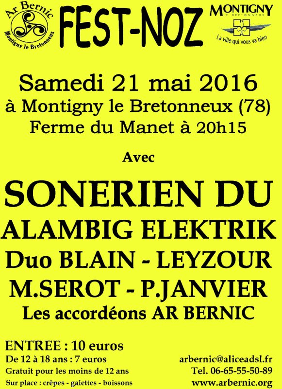Il vous sera possible d'acheter vos entrées pour le Fest-Noz dans le hall de la Mairie de Montigny le Bretonneux, le mecredi 18 mai de 17h30 à 19h30.